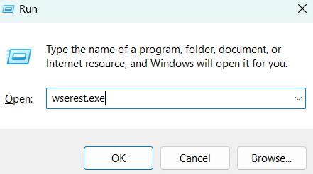 - Type wsreset.exe in the Run dialog box