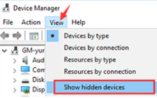 - In the Device Manager window, click the View tab, and select Show hidden devices