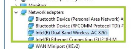 - In the Device Manager, go to the Network Adapters section and expand it and look for Intel wireless adapter names like Intel Dual Band Wireless AC-8265. Note down the adapter name somewhere.