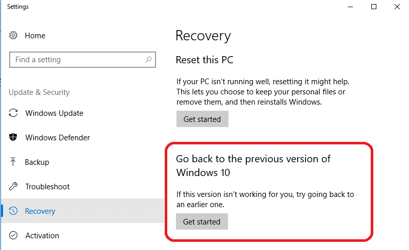 - On the right side, under ‘Go back to the previous version of Windows 10’, click ‘Get Started.’
