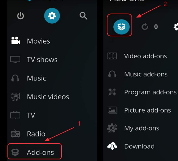 - Come back to Kodi home page. Click Add-ons in the Menu section in the left pane and then click the Package icon