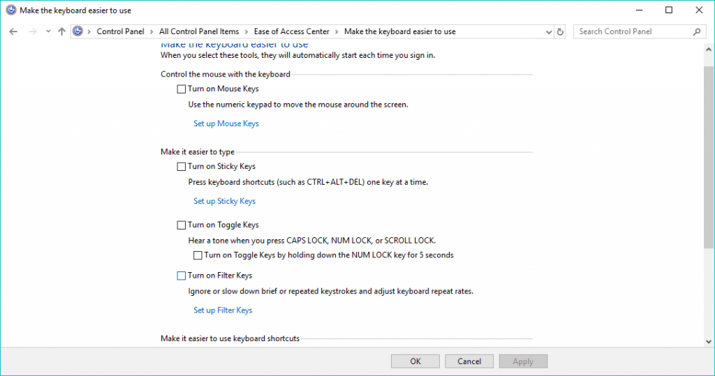 - Make sure the Turn On filter keys option is not checked. If you see a checkmark, click the box to uncheck the option