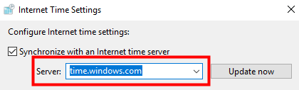 - Ensure the box before Synchronize with an internet server is checked. Click the Update now Next click OK