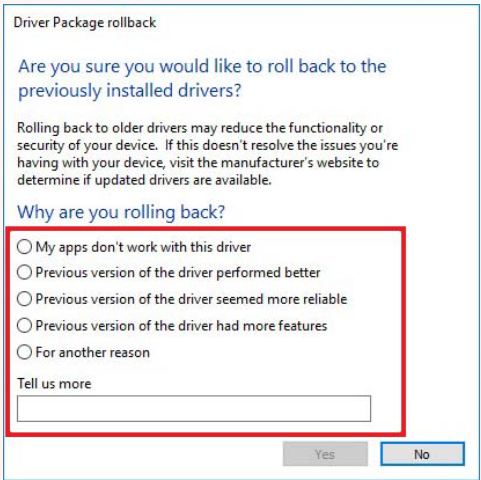 - Select the appropriate reason for rolling back to an earlier version and click the Yes button