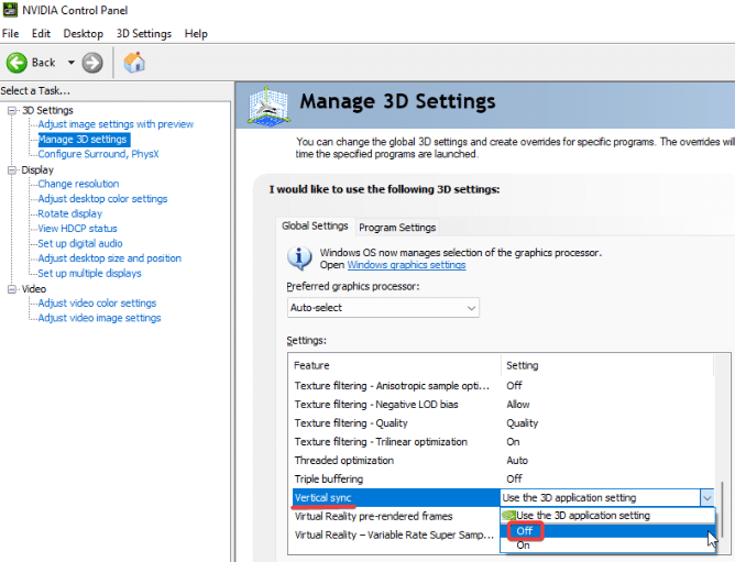 - Under the I would like to use the following 3D settings section, select Off from the drop down menu next to Vertical sync