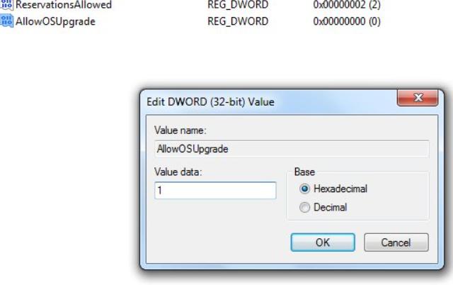 - Double-click the AllowOSUpgrade key and change its value to 0. Make sure the hexadecimal option is selected when you make the changes to the value.