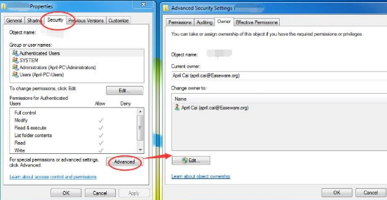 - In the Properties window, click Security (the third tab from the left) and then click Advanced. Now click the Owner tab and then click the Edit button