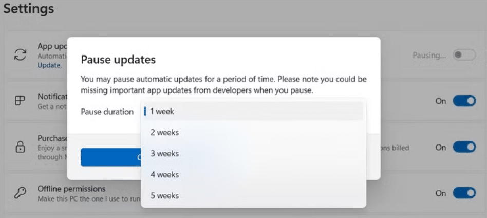 While you can still toggle off the “App Update” option, but it doesn’t completely stop updates. Instead, it only lets you pause updates. Microsoft has set a pause duration from one to five weeks.