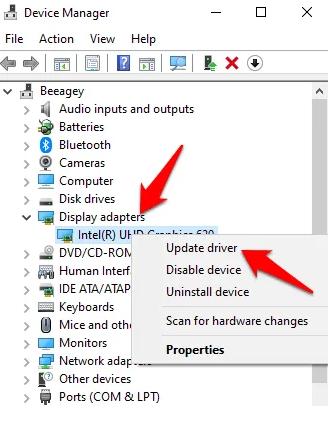 - In the Device Manager window, go to the Display adapters section and expand the list
