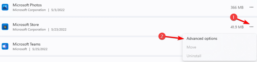- Go to Microsoft Store, click the three-dot menu next to it, and select Advanced options