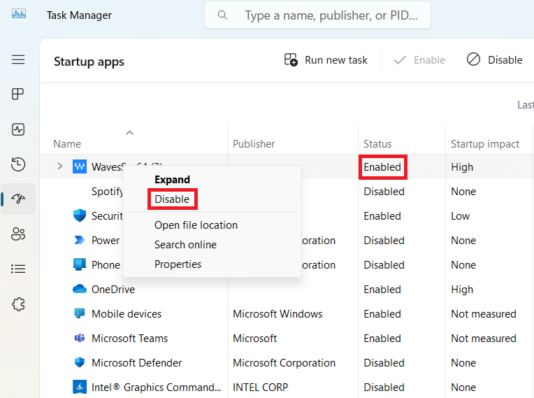 - Select each Enabled item one by one (Check the Status field for a process or app to see if it’s disabled or enabled), right-click it, and select Disable